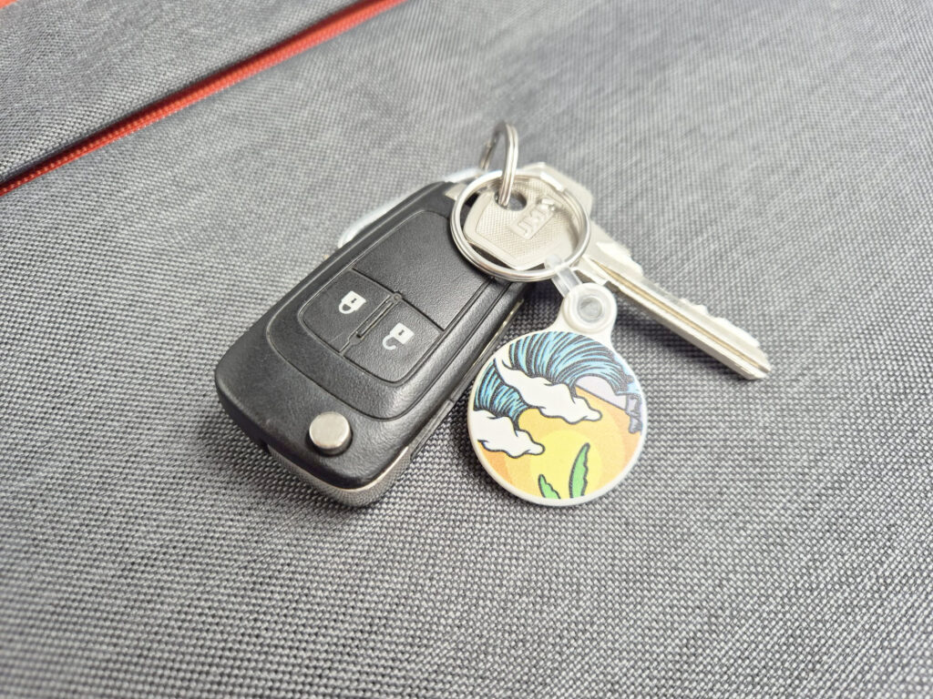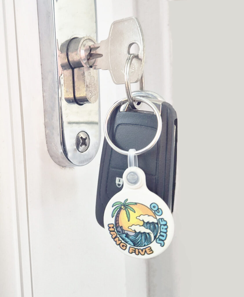 Round 30mm keyring made in the UK.