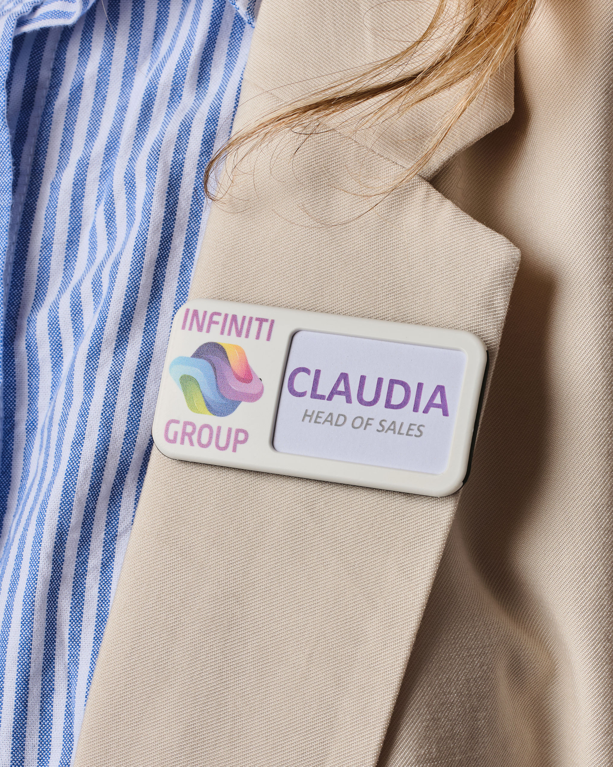 – Reusable rectangle name badges with right name window.