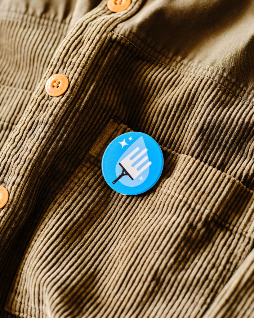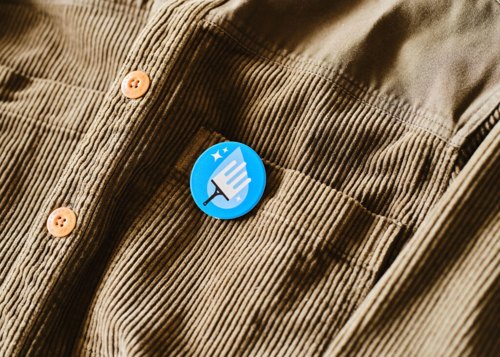 > A circular 45mm pin badge – safety pin fitting.