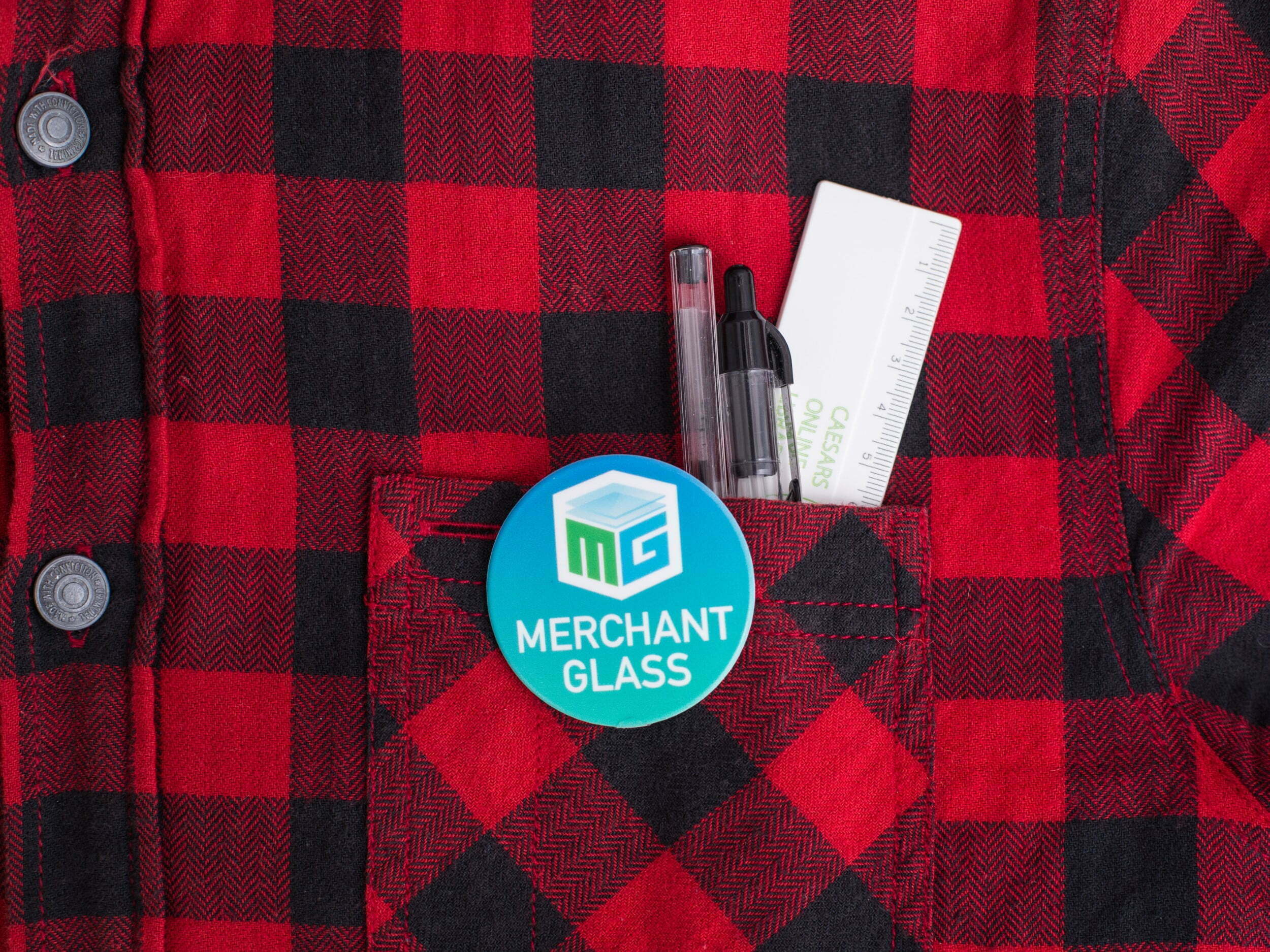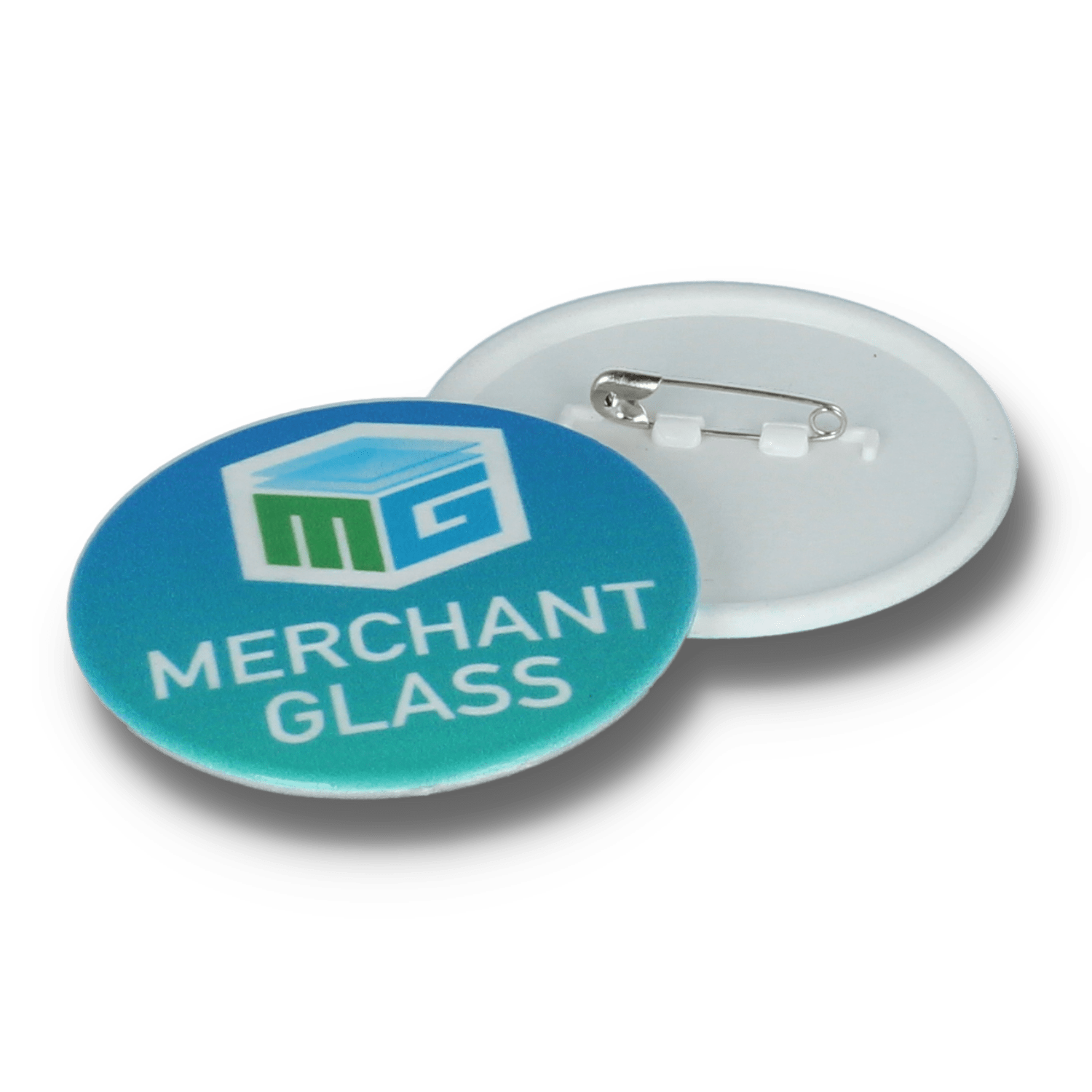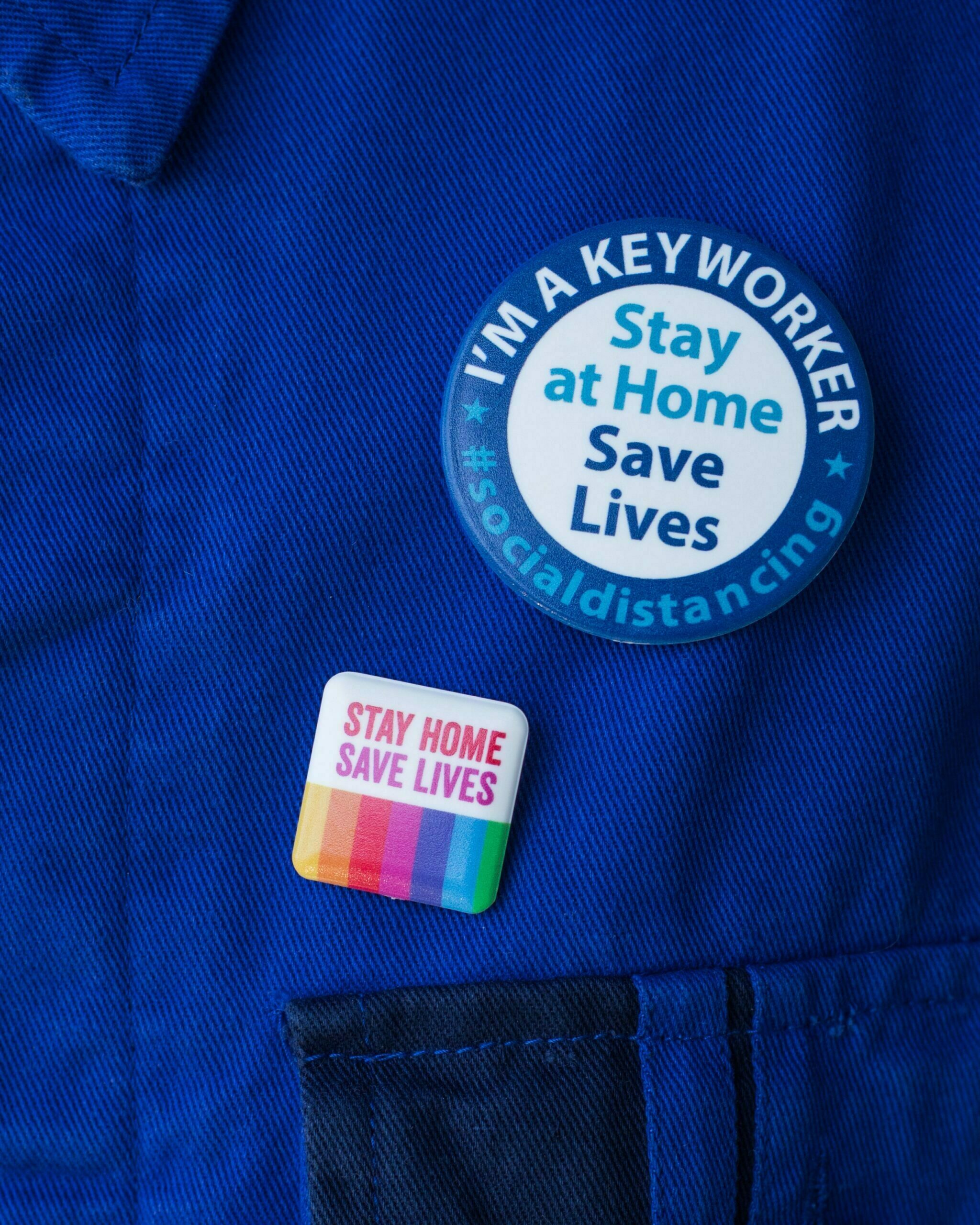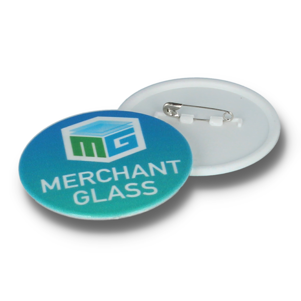 > A circular 55mm pin badge – safety pin fitting.