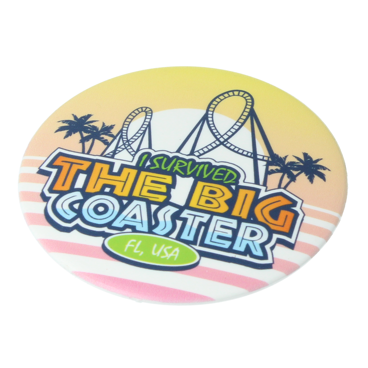 > A circular 75mm pin badge – safety pin fitting.