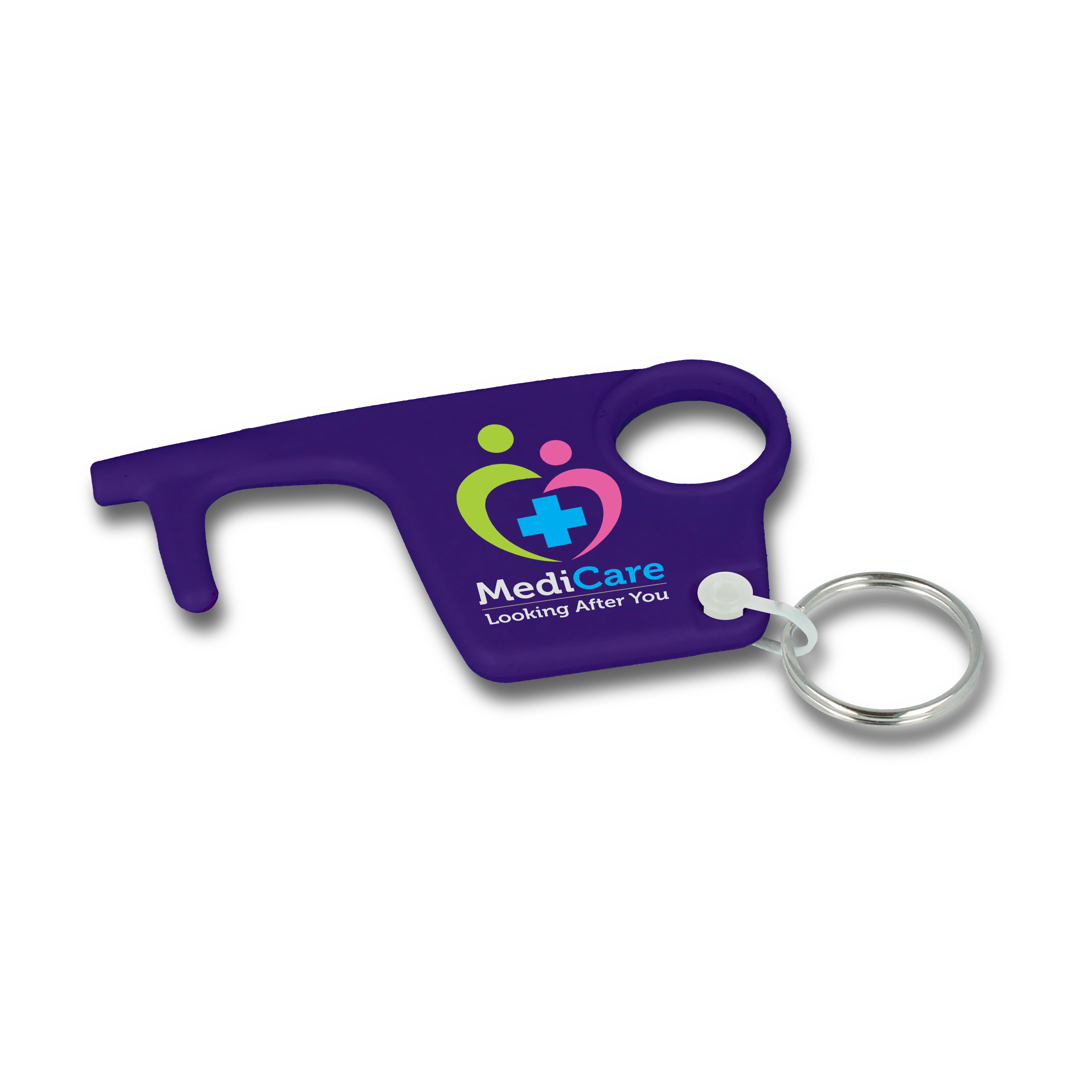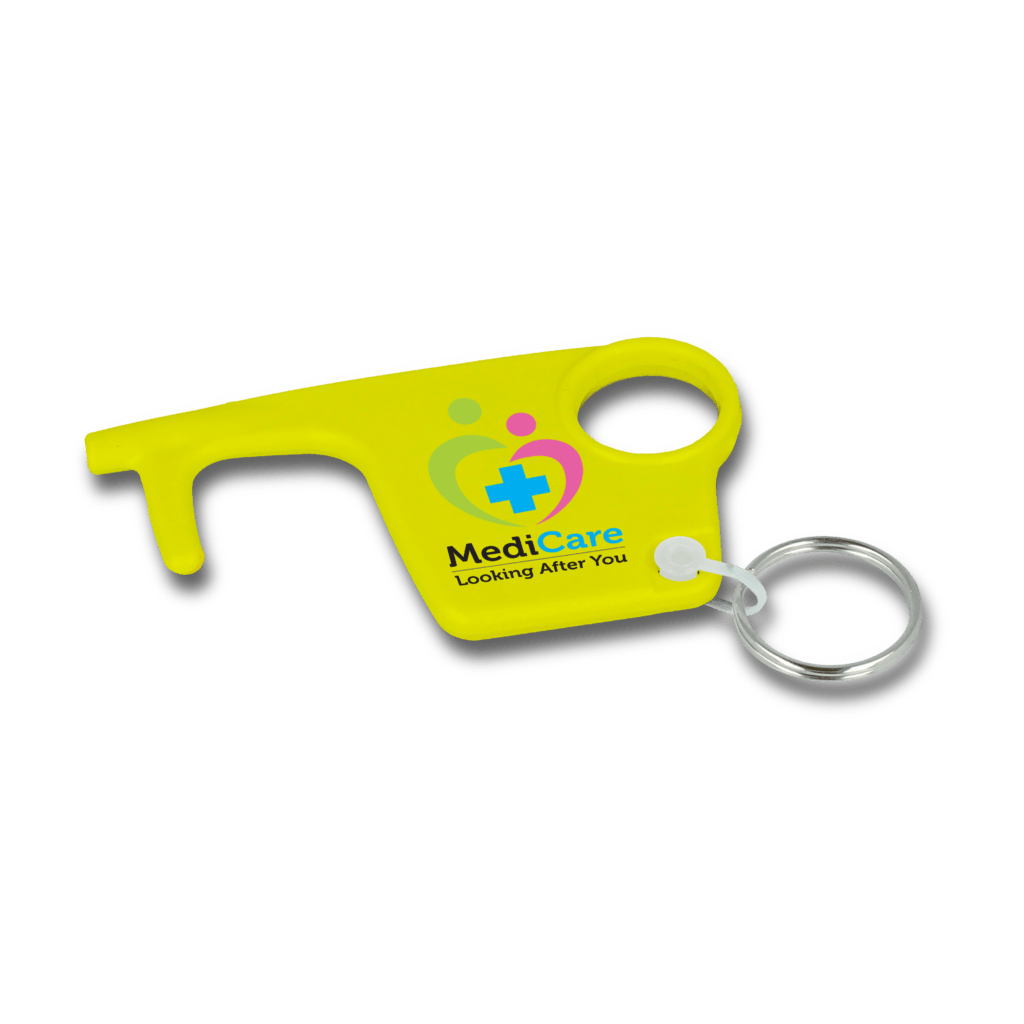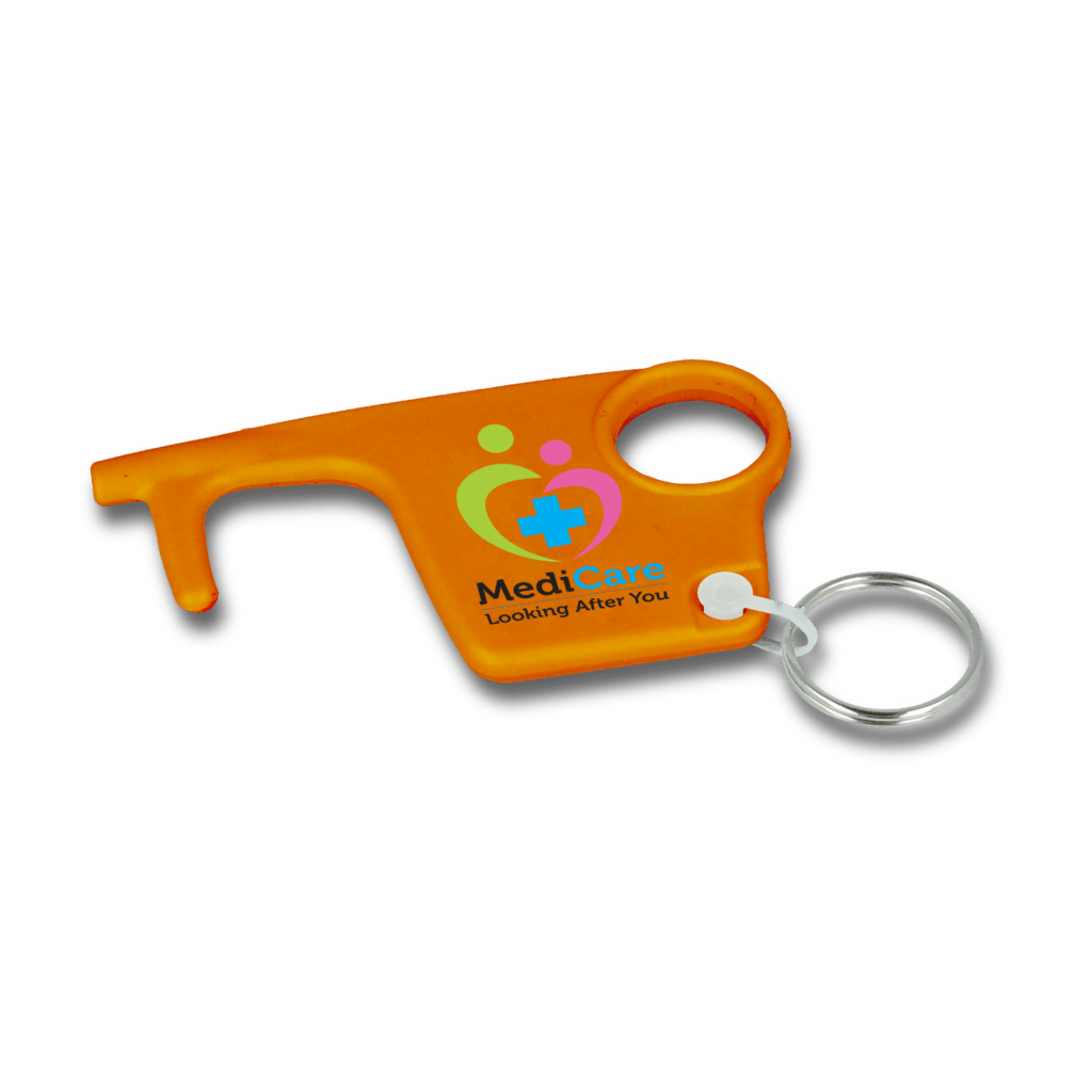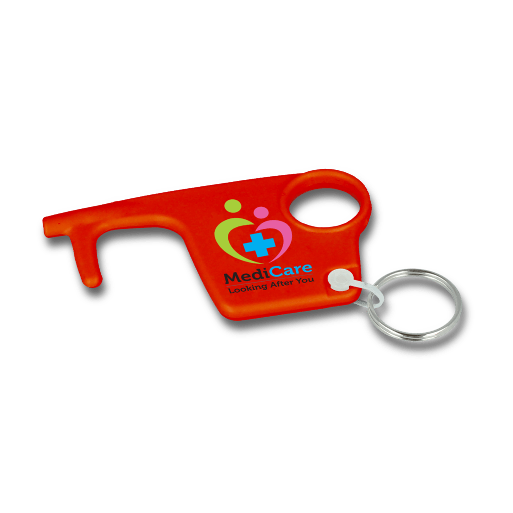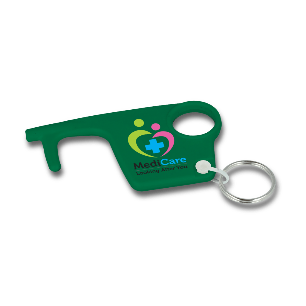 The ideal promotional product for health-conscious campaigns, workplace wellbeing initiatives, and corporate giveaways. This practical accessory features four integrated functions in one portable design: a flat stylus tip for touchscreens, a finger hole for pulling doors and pressing buttons, a convenient keyring loop, and a handy door hook for hands-free access.