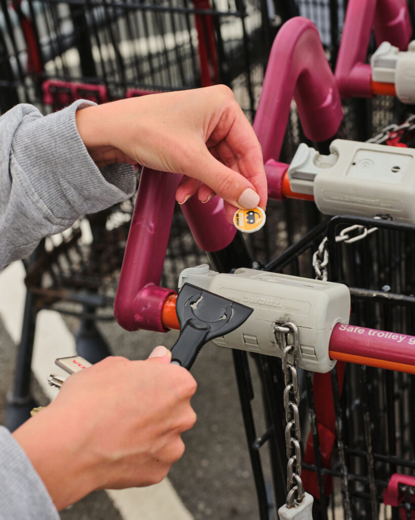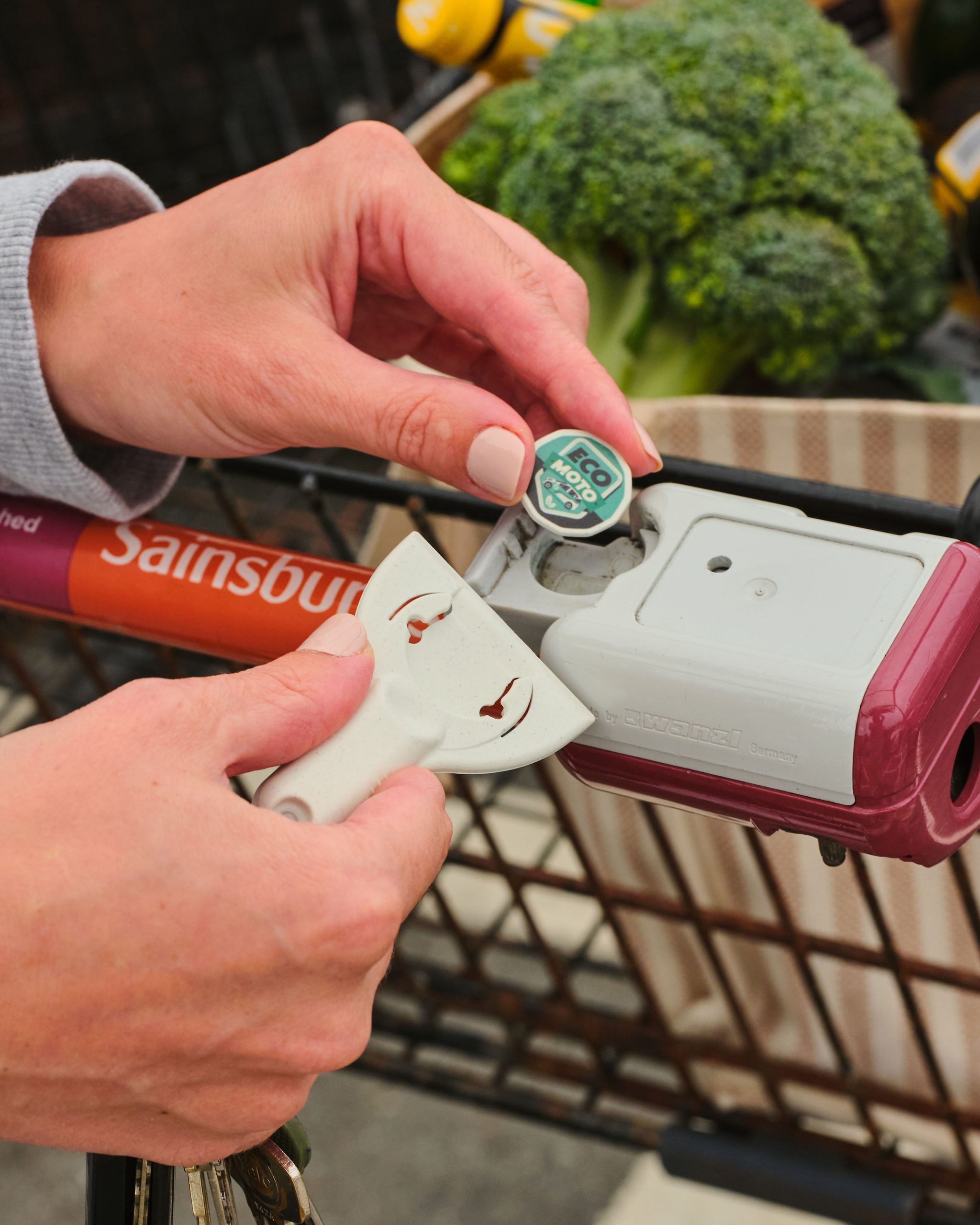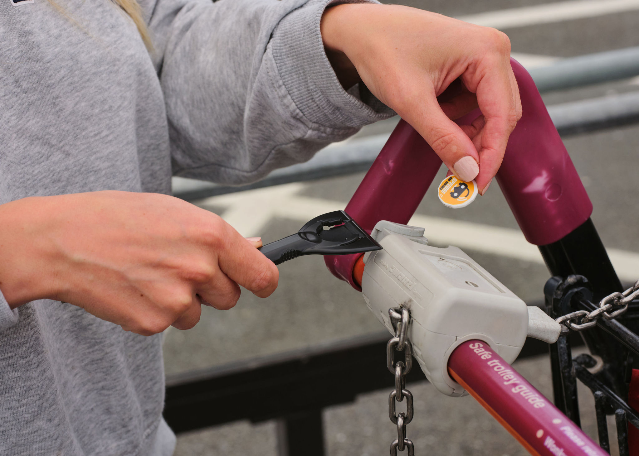 > A pocket ice scraper and £1 shaped trolley coin all- in-one.