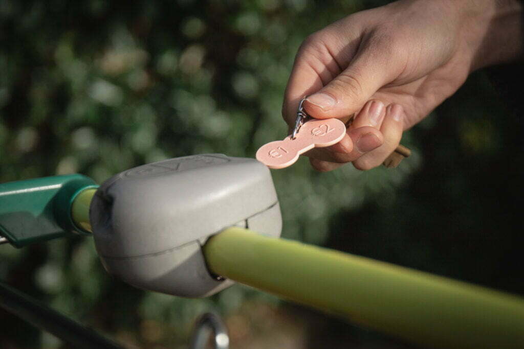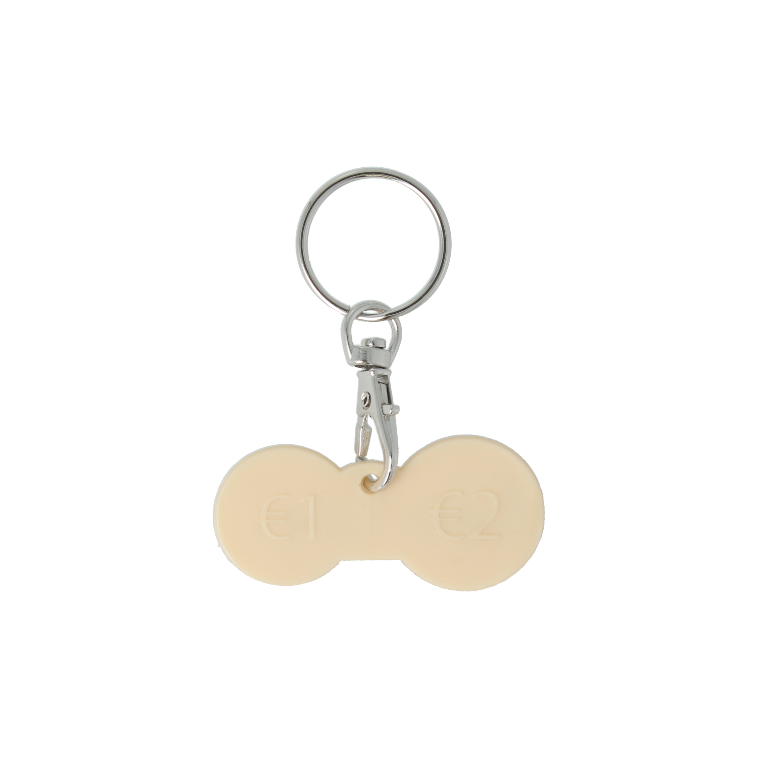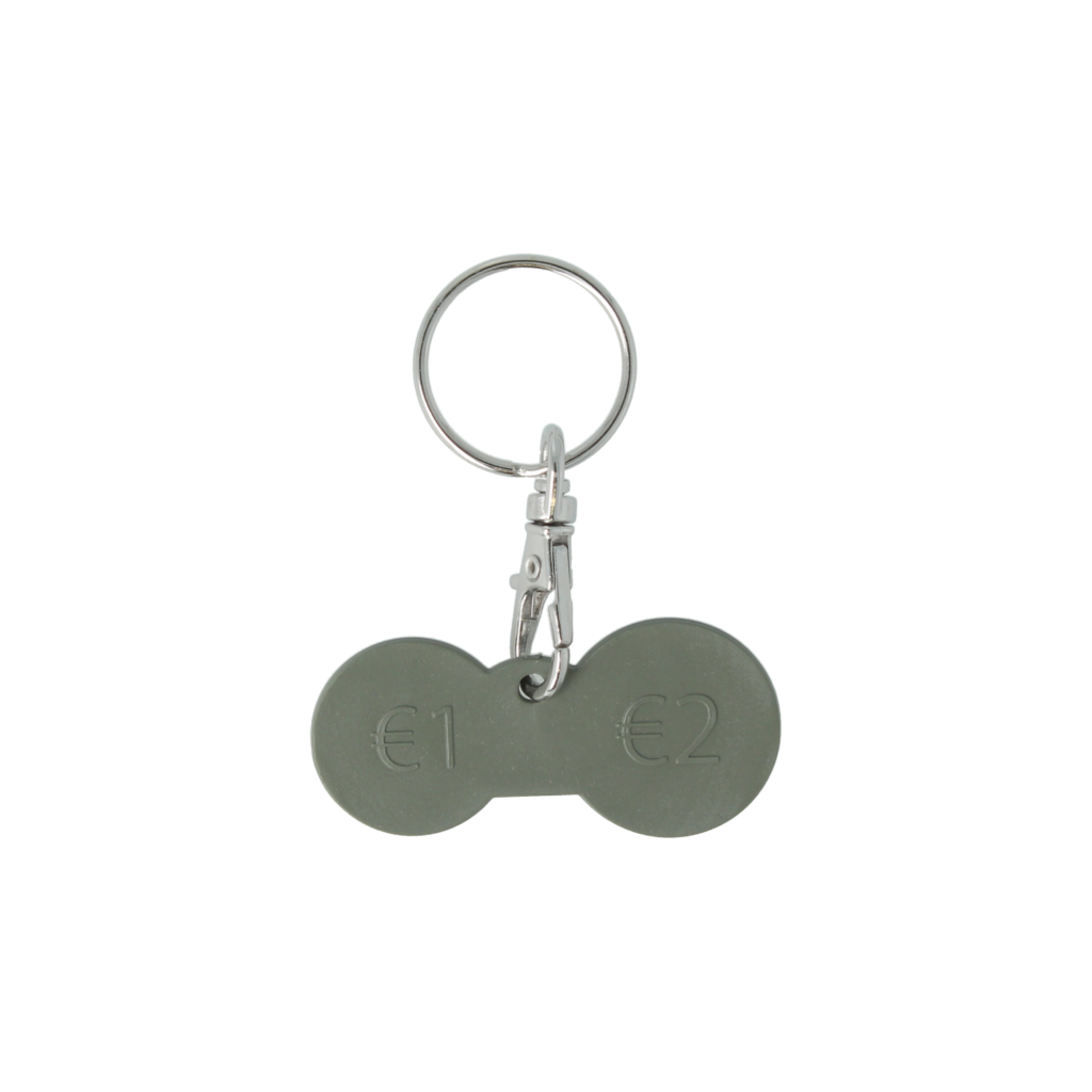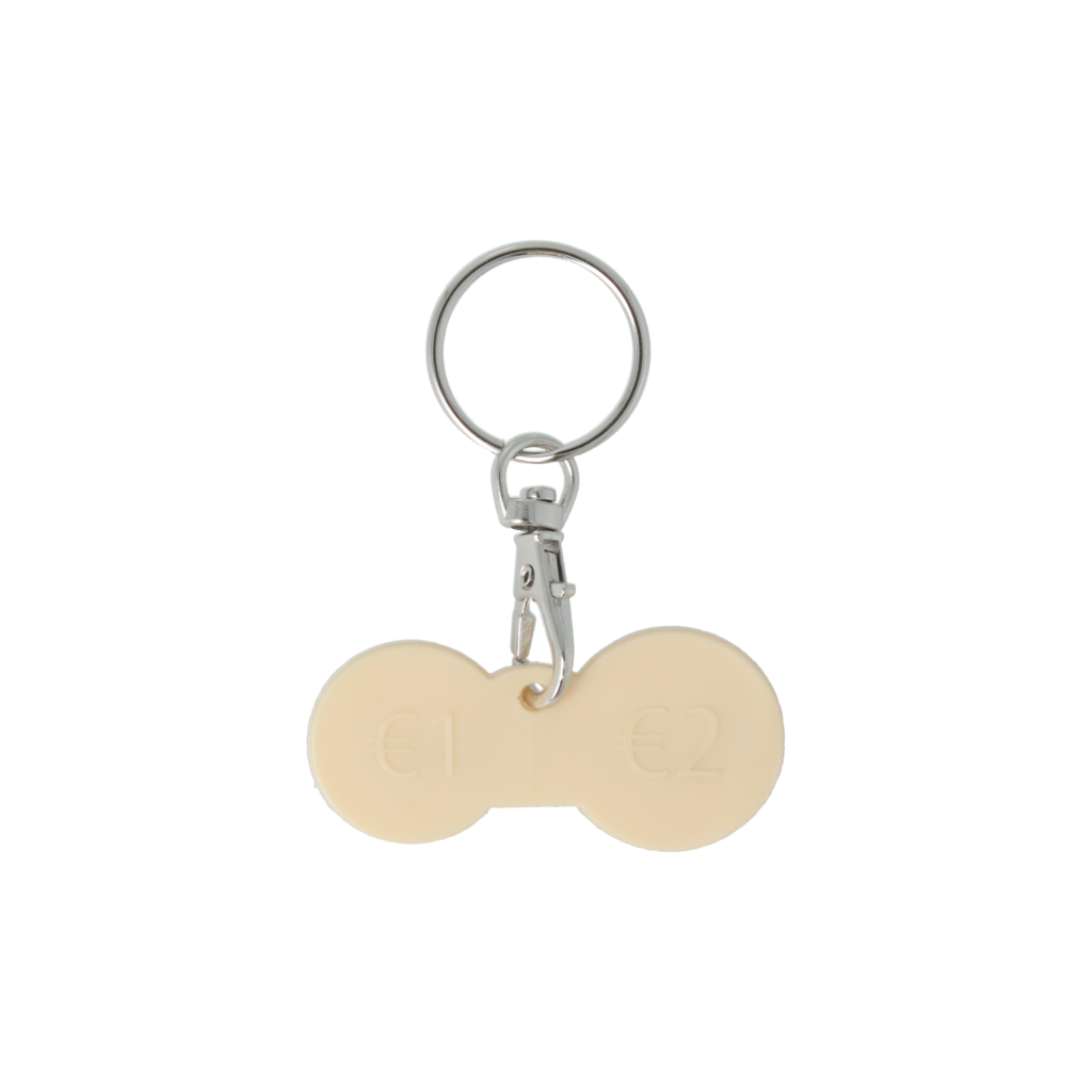 > Keyring offering 1 euro and 2 euro shaped coins, at each end.