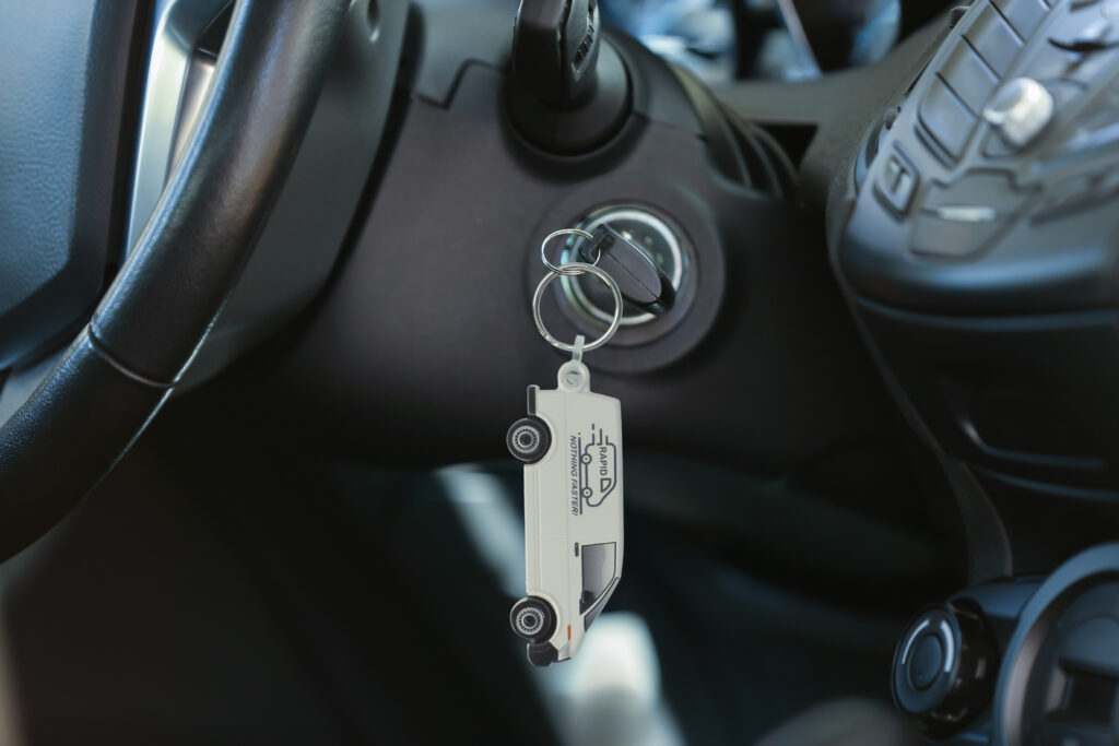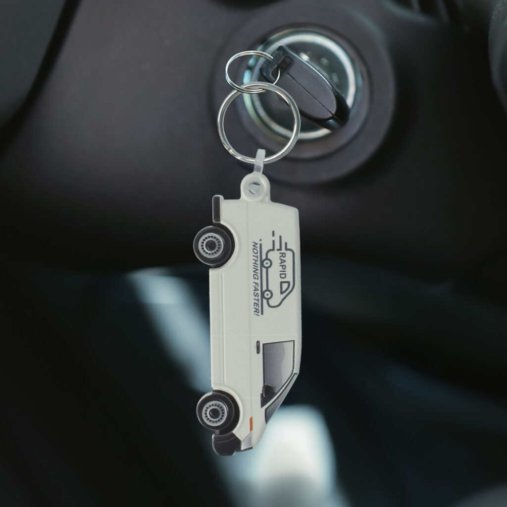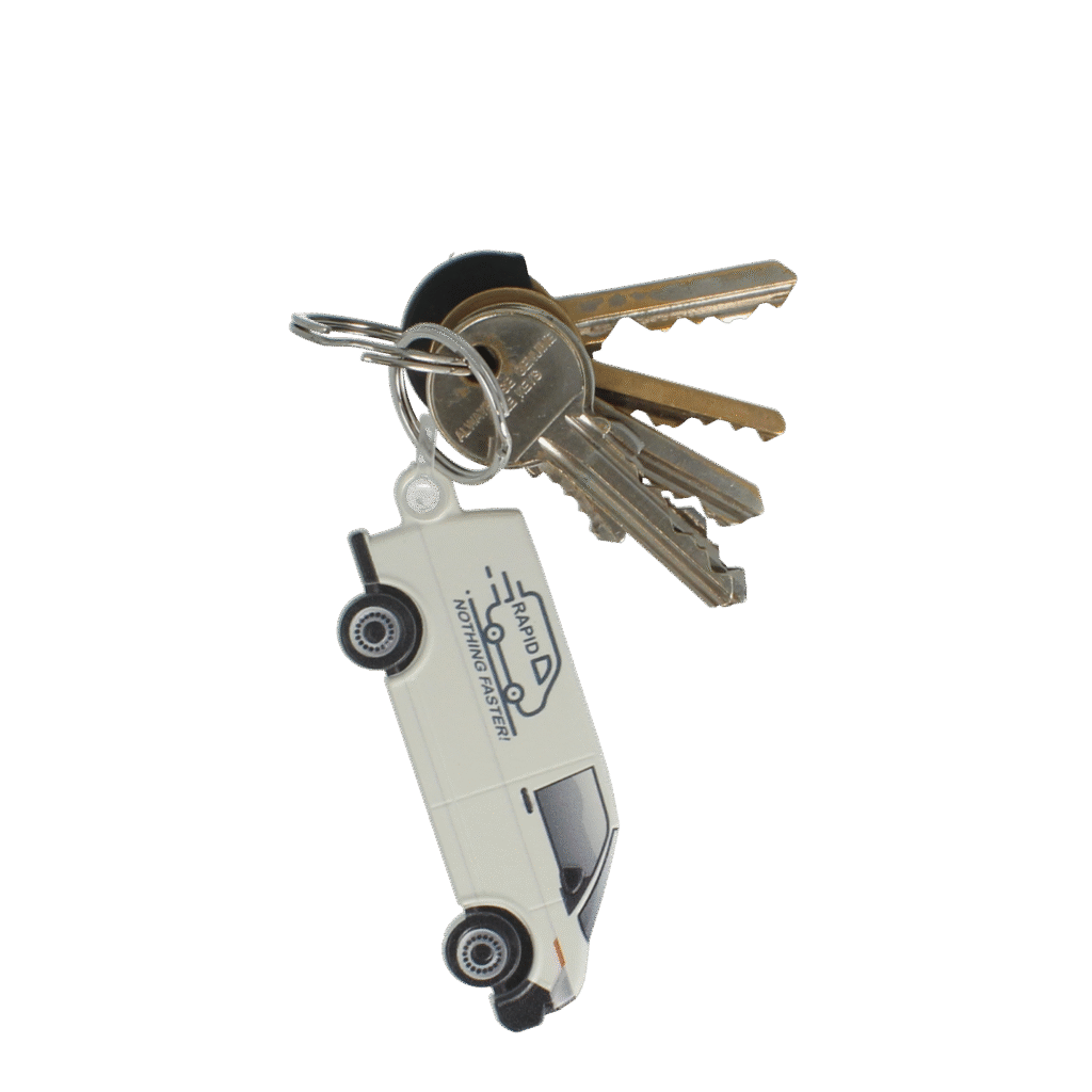 Our panel van shaped ‘funkey’ keyring, made in the UK from recycled plastic or recycled R+ which has a speckled appearance.