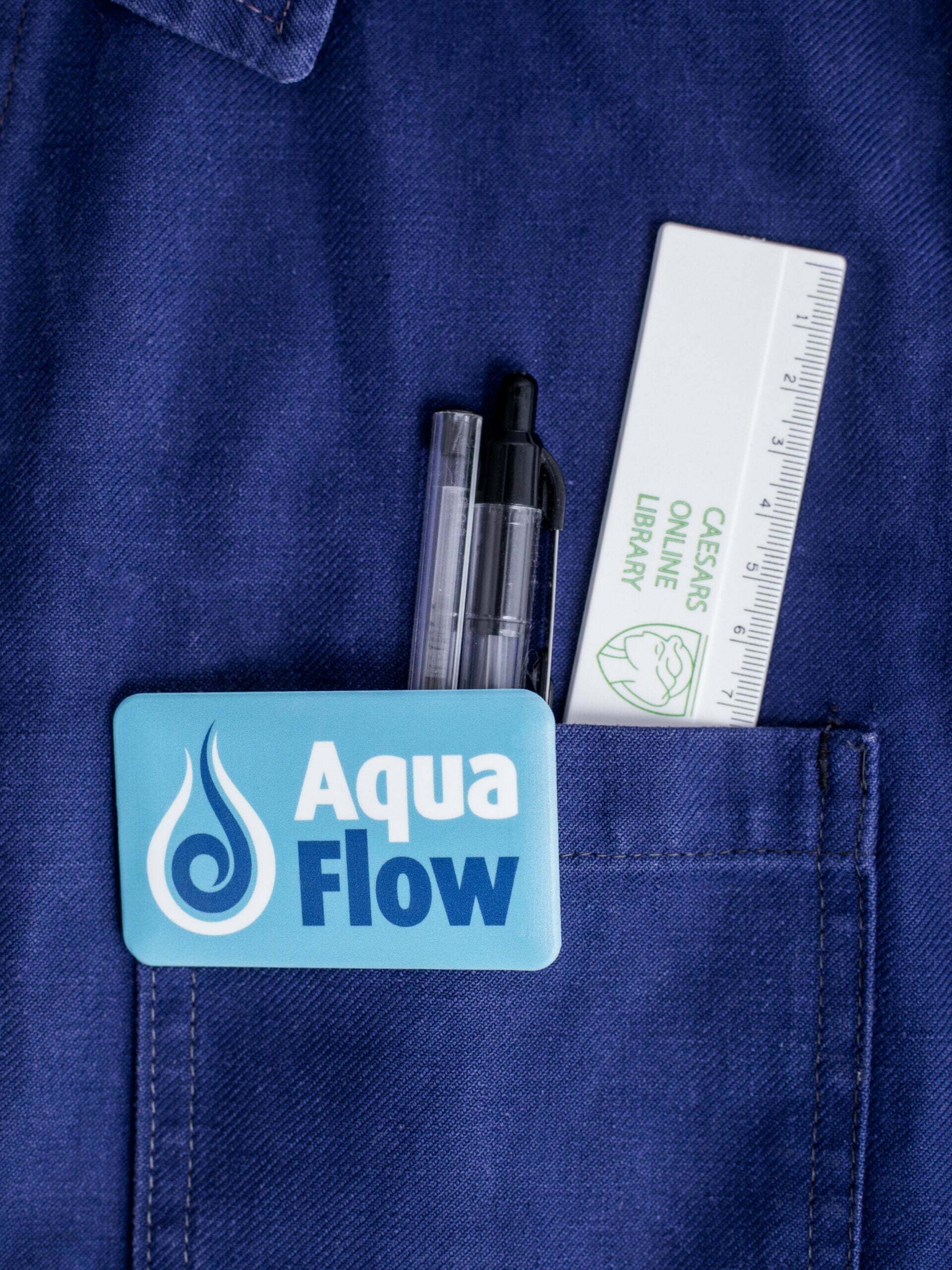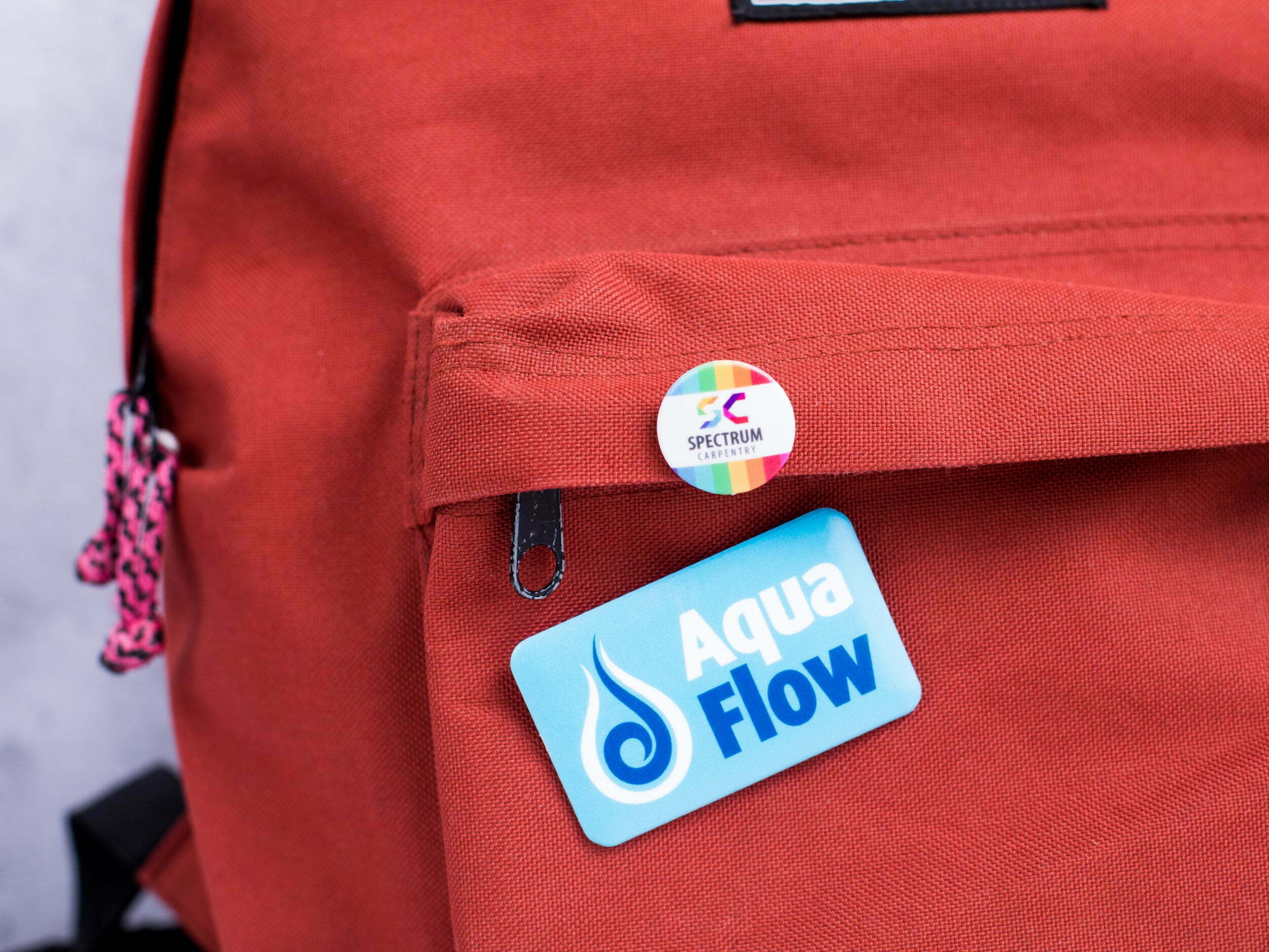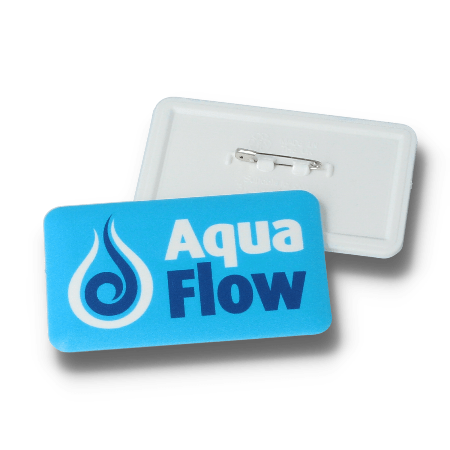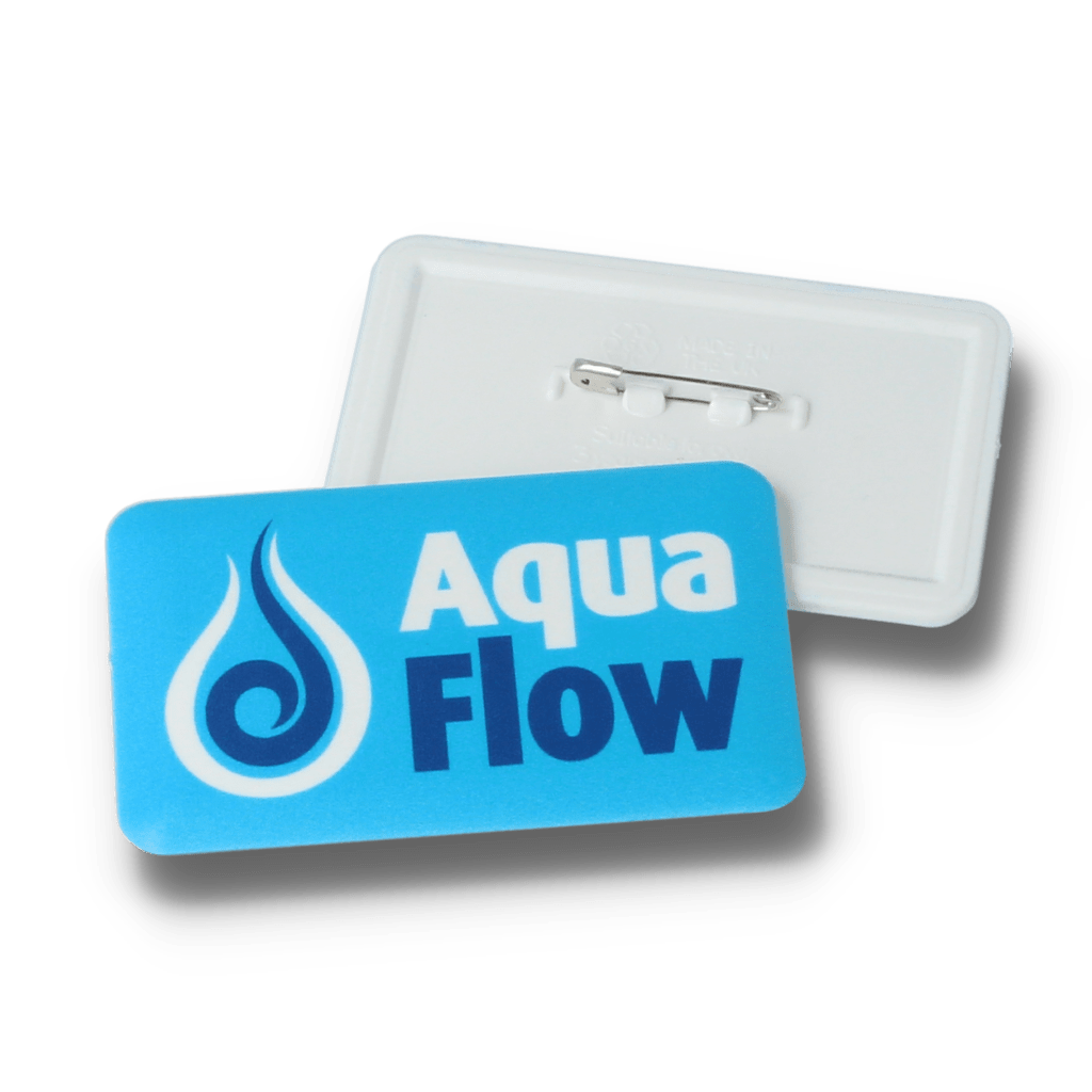 > A rectangular 70mm x 43mm pin badge – safety pin fitting.