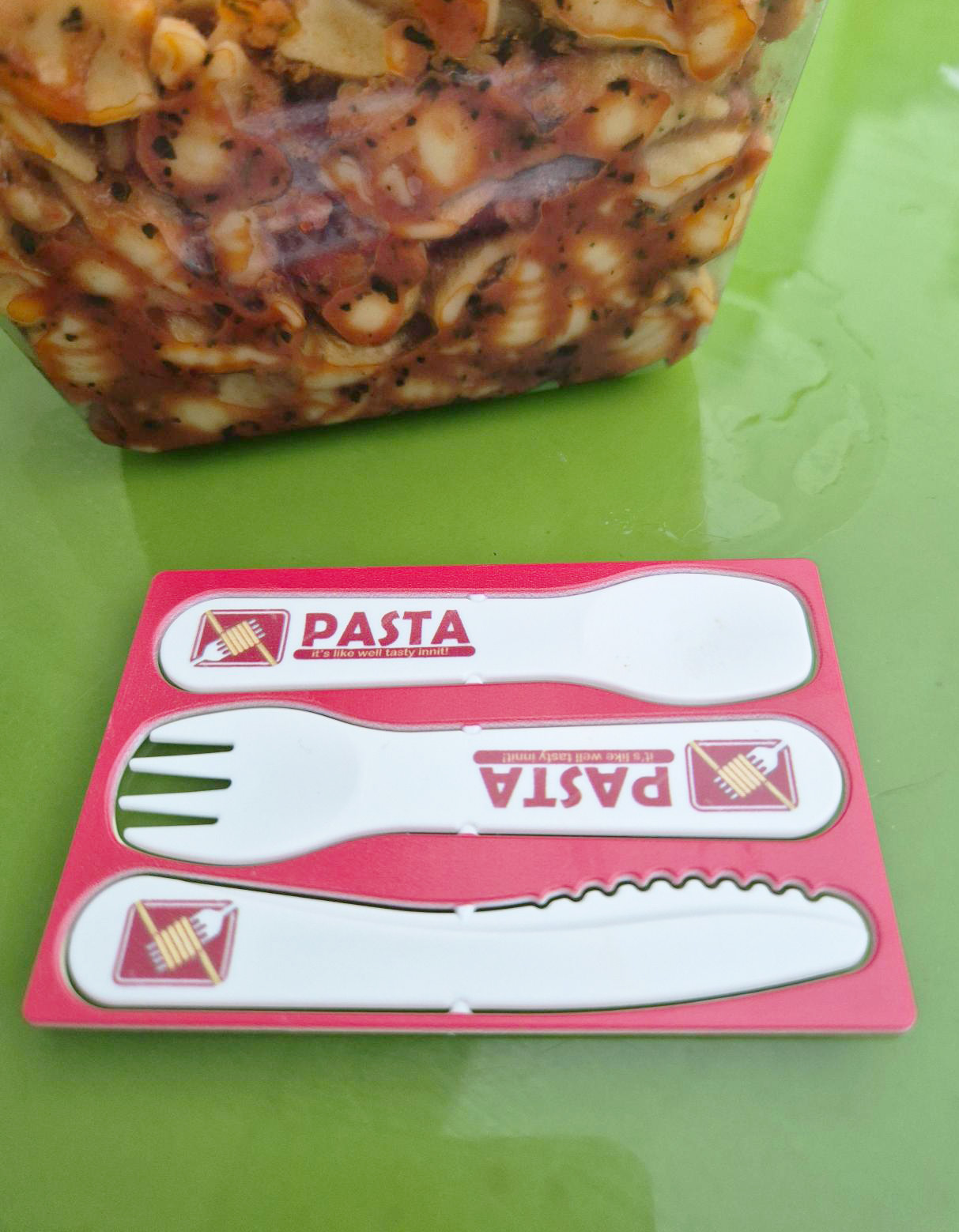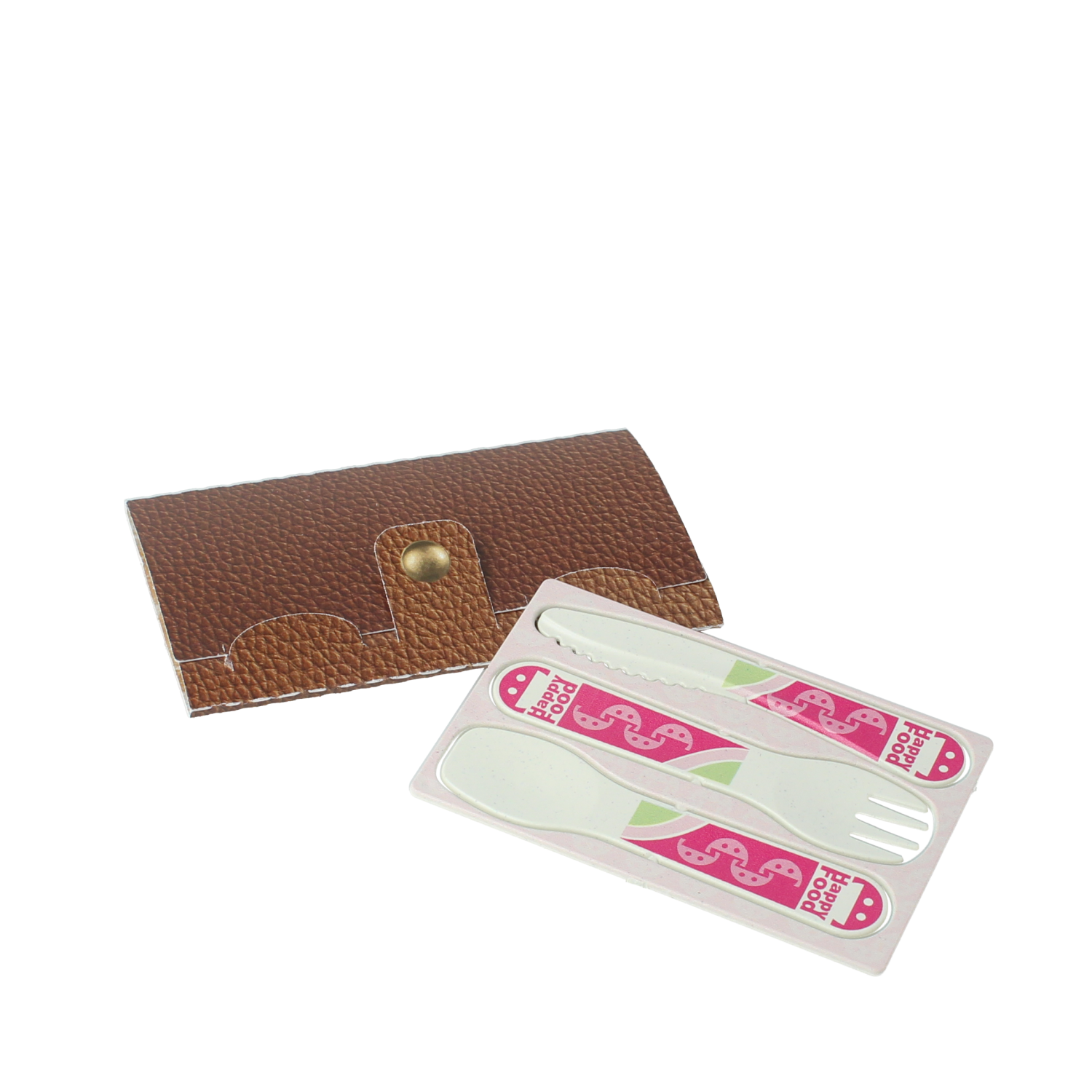 > 2.3mm thick Mini cutlery (knife, fork and spoon) in a credit card style holder.